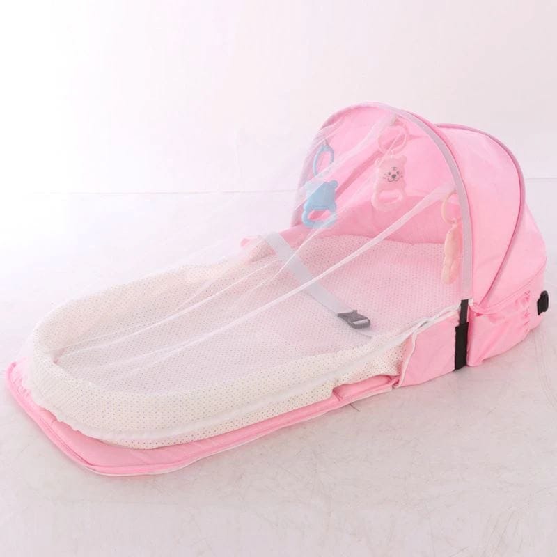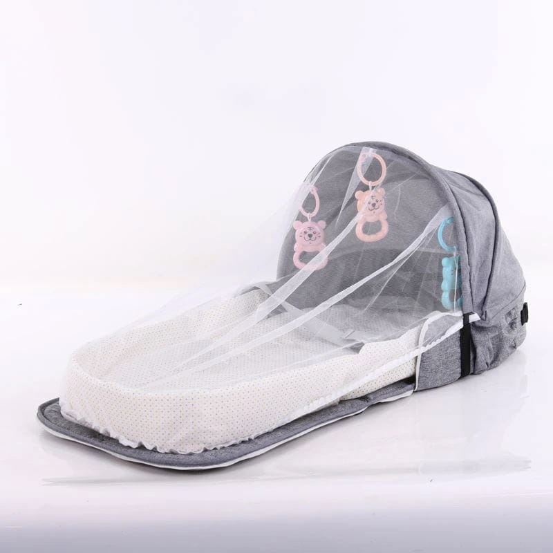 1* Cama de bebê, com proteção para cabeça e cortina contra mosquitos