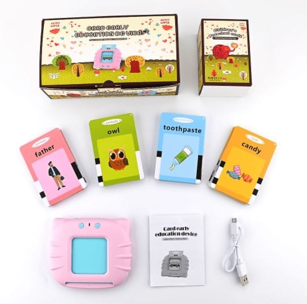 O brinquedo acompanha um cabo carregador USB e 112 cartões (frente e verso) totalizando 224 palavras diferentes.